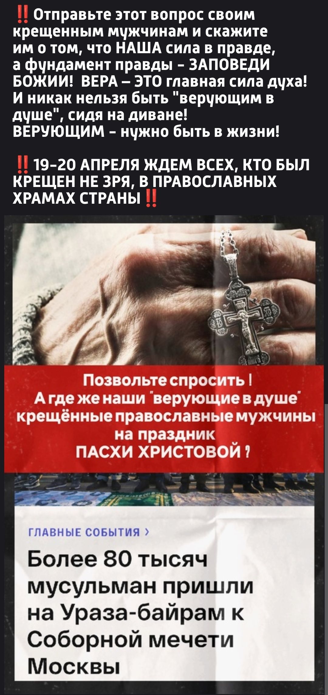 !! Отправьте этот вопрос своим крещеным мужчинам и скажите им о том, что НАША сила в правде, а фундамент правды – ЗАПОВЕДИ БОЖИ! ВЕРА – ЭТО главная сила духа! И никак нельзя быть "верующим в душе", сидя на диване! ВЕРУЮЩИМ – нужно быть в жизни! !! 19-20 АПРЕЛЯ ЖДЕМ ВСЕХ, КТО БЫЛ КРЕЩЕН НЕТ ЗРЯ, В ПРАВОСЛАВНЫХ ХРАМАХ СТРАНЫ !! Позвольте спросить! А где же наши 'верующие в душе' крещённые православные мужчины на праздник ПАСХИ ХРИСТОВОЙ? ? ГЛАВНЫЕ СОБЫТИЯ > Более 80 тысяч мусульман пришли на Ураза-байрам к Соборной мечети Москвы