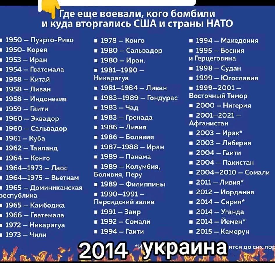 " ее еще воевали, кого бомбили икуда вторгались США и страны НАТО. + 1950 — Пуэрто-Рико — = 1978 — Конго # 1994 — Македония ‚ 1950- Корея # 1980 — Сальвадор — в 1995 — Босния н 1953 — Иран # 1980 — Ира и Герцеговина. 1954 — Гватемала # 19811990 — # 1998 — Судан 1958 — Китай Никарагуа # 1999 — Югославия 1956 — Ливан # 1981-1984 — Ливан — в 1999-2001 — ‚ 1958 — Индонезия: 1983-1989 — Гондурас — Восточный Тимор 1959 — Гаити # 1983 — Чад # 2000 — Нигерия в 1960 — Эквадор. ® 1983 — Гренада п2оо2ов - в 1960 — Сальвадор — = 1986 — Лномя Ё ‚ ‚ 1961 — Куба = 1986 — Боливия :::: 8 ;:Ё: а н 1962 — Таиланд. ® 1987-1988 — Иран и Г:и'ир 1964 — Конго = 1989 — Панама 2004— Пакистан 19641973 — Лаос — ® 1989 — Колунбия, 2004—2010 — Сомали 19641975 — Вытнам — Боливия, Перу ы 1965 — Дониинанская — # 1989 — Филитенны — # 201 — Ливим зеспублика. = 19901991 — 2012 — Иордания. ‚ 1965 — Камбоджа: Персидский залив 2014 — Сирия* а1966 ГослОЫ 1991 — Заир. 2014 — Уганда. ПАЗОРЛА 1992 — Сонали 2014 — Йемен* 1994 — Гаити 2015 — Камерун н 1973 — Чили знаг 2014 украина'"-е7