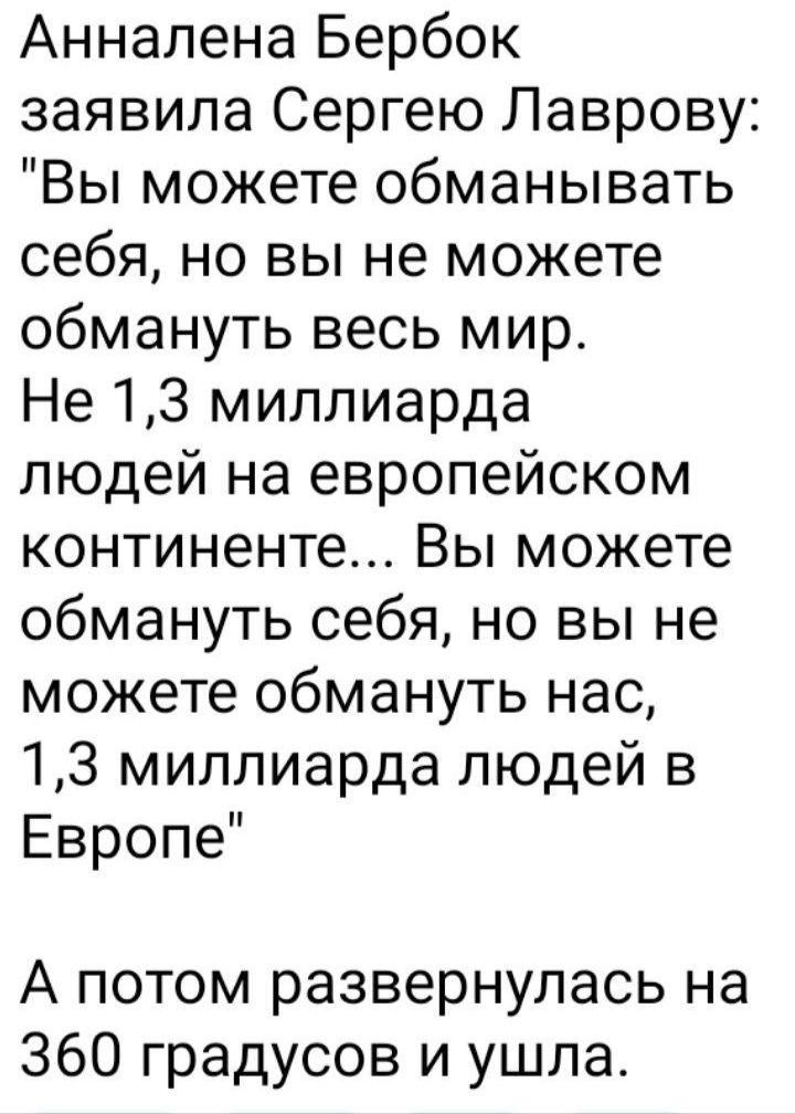 Анналена Бербок заявила Сергею Лаврову Вы можете обманывать себя но вы не можете обмануть весь мир Не 13 миллиарда людей на европейском континенте Вы можете обмануть себя но вы не можете обмануть нас 13 миллиарда людей в Европе А потом развернулась на 360 градусов и ушла