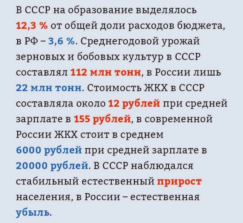В СССР на образование выделялось 123 от общей доли расходов бюджета в РФ 36 Среднегодовой урожай зерновых и бобовых культур в СССР составлял 112 млн тонн в России лишь 22 млн тонн Стоимость ЖКХ в СССР составляла около 12 рублей при средней зарплате в 155 рублей в современной России ЖКХ стоит в среднем 6000 рублей при средней зарплате в 20000 рублей В СССР наблюдался стабильный естественный прирост