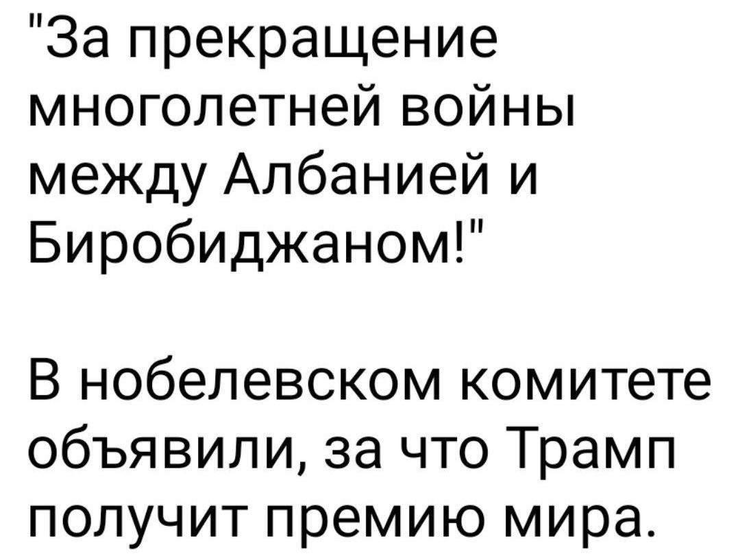 "За прекращение многолетней войны между Албанией и Биробиджаном!" В нобелевском комитете объявили, за что Трамп получит премию мира.