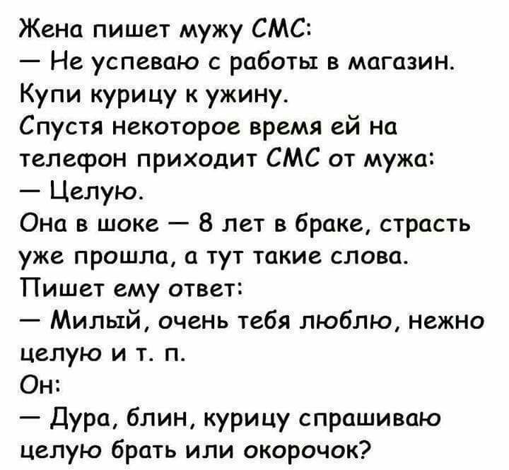 Жена пишет мужу СМС Не успеваю с работы в магазин Купи курицу к ужину Спустя некоторое время ей на телефон приходит СМС от мужа Целую Она в шоке 8 лет в браке страсть уже прошла а тут такие слова Пишет ему ответ Милый очень тебя люблю нежно целую и т п Он Дура блин курицу спрашиваю целую брать или окорочок