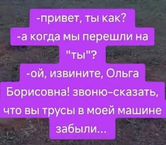 -привет, ты как? -а когда мы перешли на "ты"? -ой, извините, Ольга Борисовна! звоню-сказать, что вы трусы в моей машине забыли...