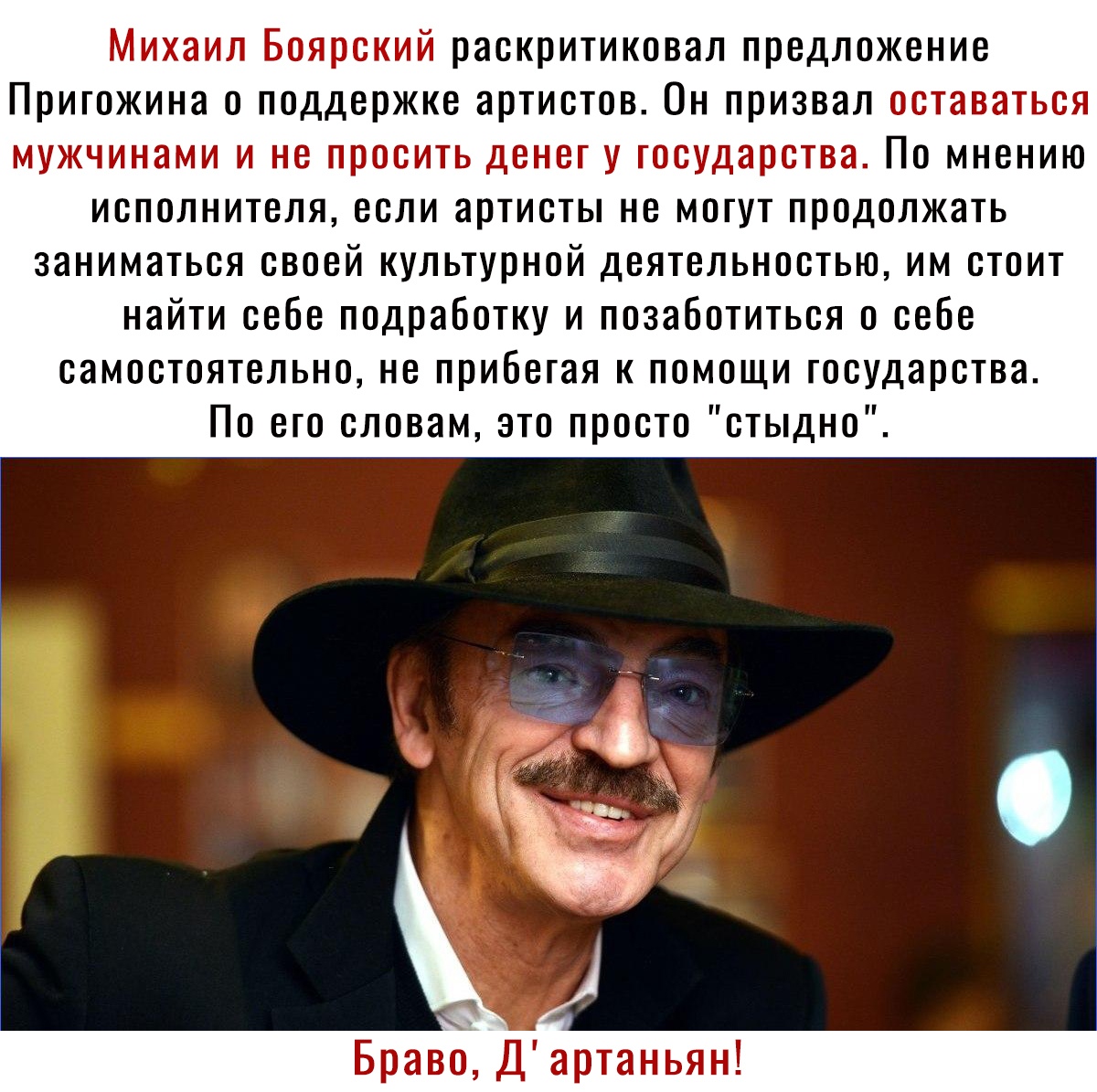 Михаил Боярский раскритиковал предложение Пригожина о поддержке артистов Он призвал оставаться мужчинами и не просить денег у государства По мнению исполнителя если артисты не могут продолжать заниматься своей культурной деятельностью им стоит найти себе подработку и позаботиться о себе самостоятельно не прибегая к помощи государства По его словам это просто стыдно Браво Дартаньян