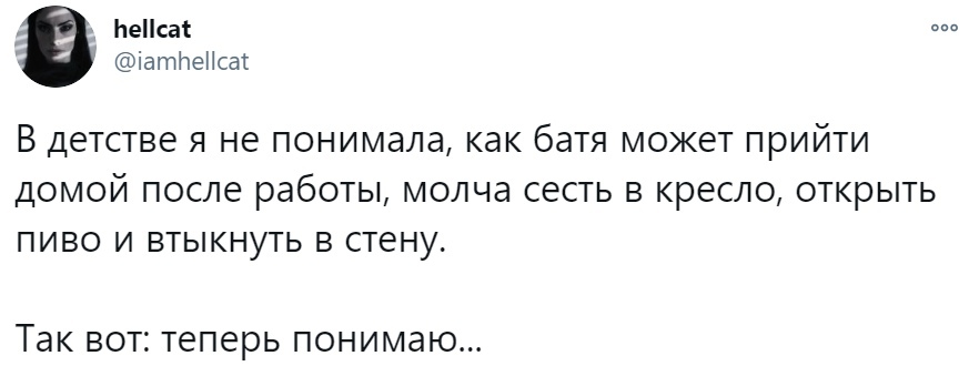 1есаі іатпеіісат В ДЕТСТВЭ Я не понимала как батя МОЖЭТ ПРИЙТИ ДОМОЙ ПОСЛЕ работы МОЛЧЭ СЭСТЬ В кресло ОТКРЫТЬ ПИВО И ВТЫКНУТЬ В стену ТЭК ВОТ теперь ПОНИМдЮ