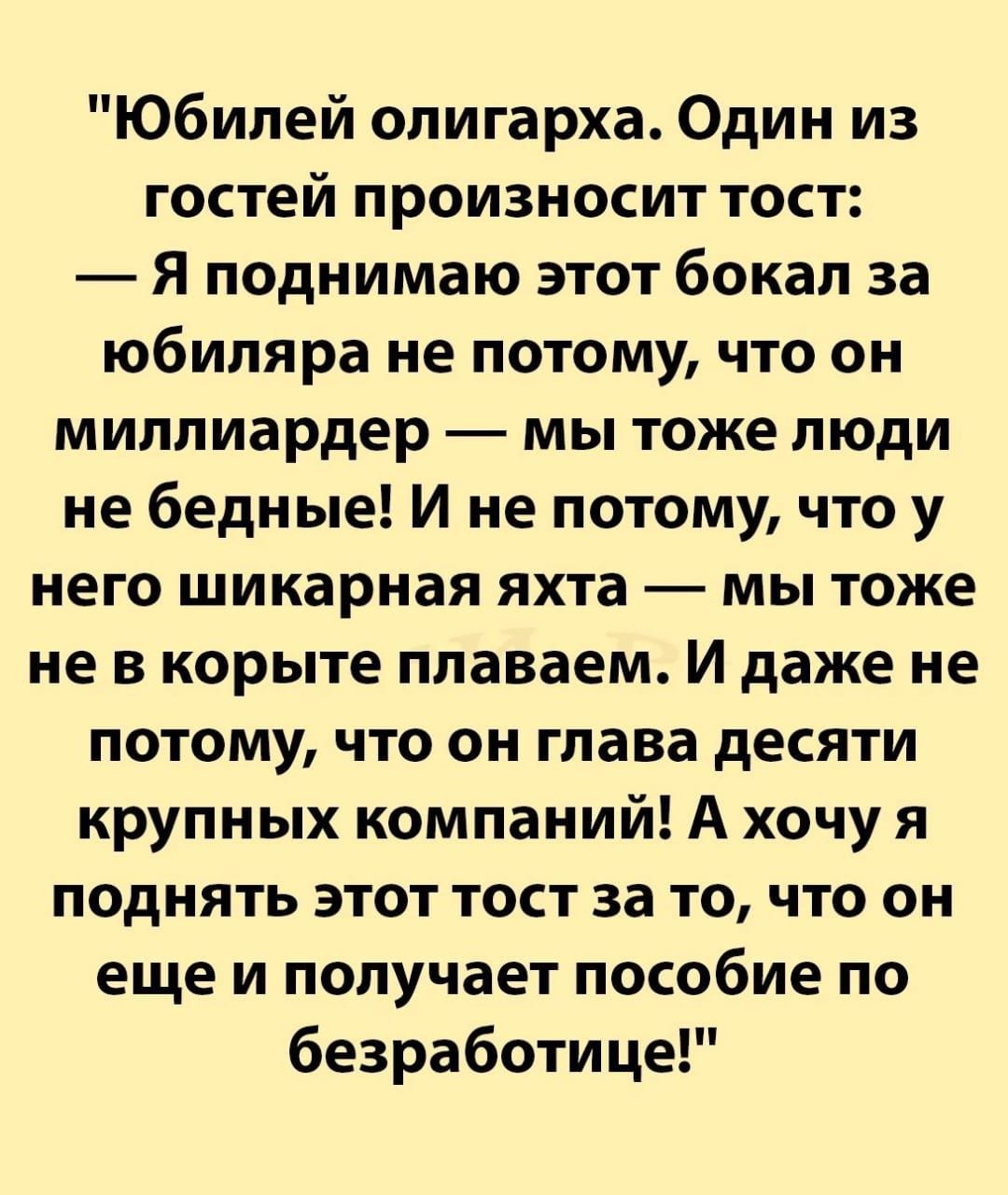 "Юбилей олигарха. Один из гостей произносит тост: — Я поднимаю этот бокал за юбиляра не потому, что он миллиардер — мы тоже люди не бедные! И не потому, что у него шикарная яхта — мы тоже не в корыте плаваем. И даже не потому, что он глава десяти крупных компаний! А хочу я поднять этот тост за то, что он еще и получает пособие по безработице!"