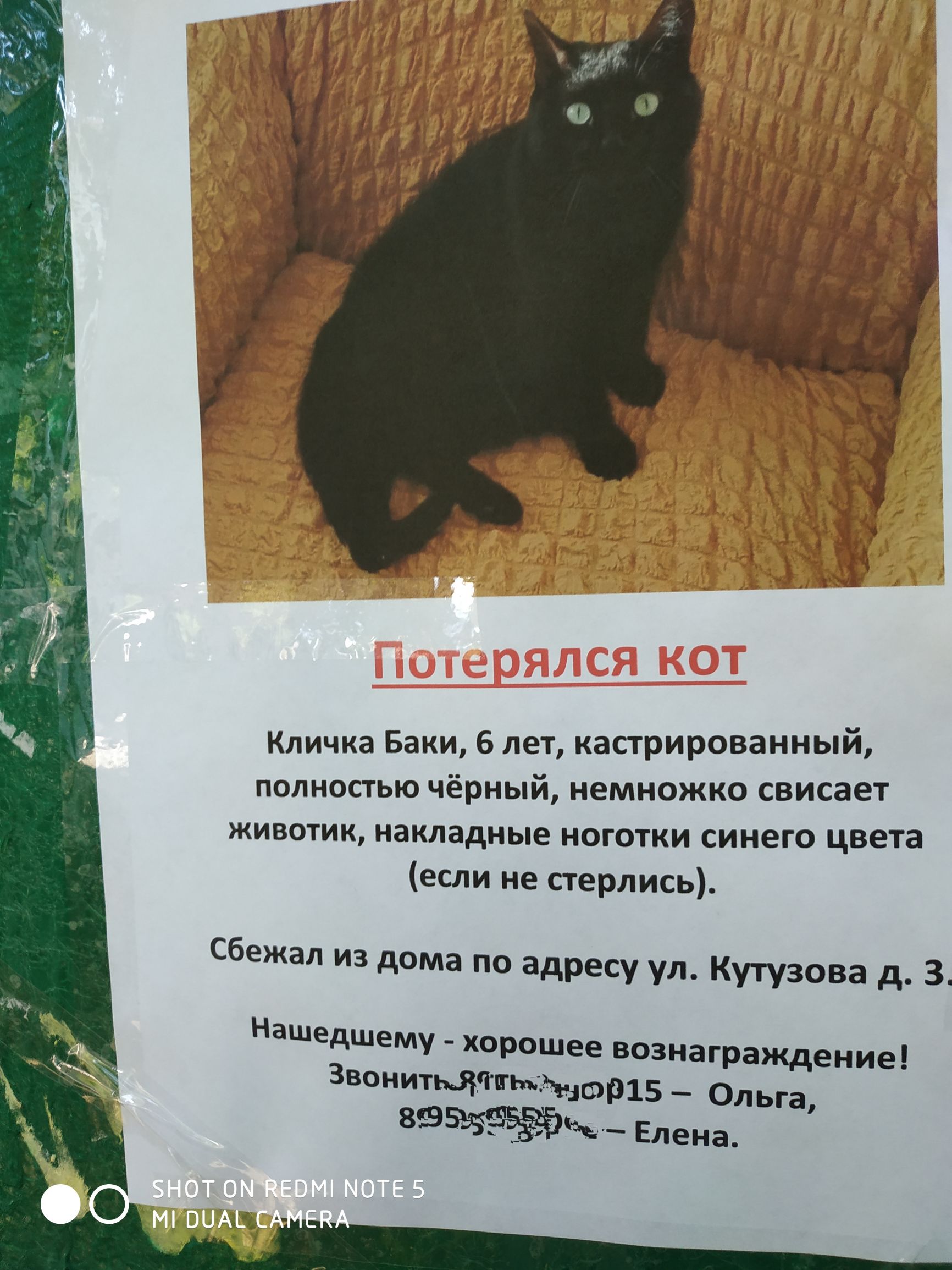 Кличка Баки 6 лет кастрированный полностью чёрный немножко свисает животик накладные ноготки синего цвета если не стерлись Сбежал из дома по адресу ул Кутузова д 3 Нашедшему хорошее вознаграЖДение Звонитщггтыщштз Ольга 89_ Елена