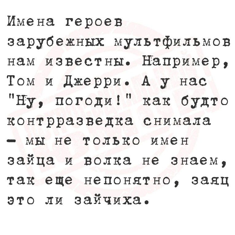 Имена героев зарубежных мультфильмов нам известны. Например, Том и Джерри. А у нас "Ну, погоди!" как будто контрразведка снимала - мы не только имен зайца и волка не знаем, так еще непонятно, заяц это ли заячиха.