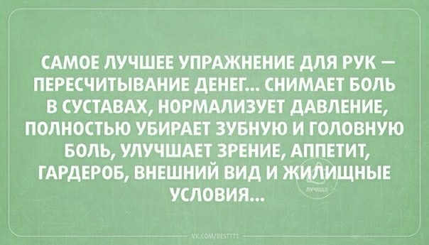 ПЕРЕСЧИТЫВАНИЕ дЕНЕГ СНИМАЕТ БОЛЬ В СУСТАВАХ НОРМАЛИЗУЕТ дАВЛЕНИЕ ПОЛНОСТЬЮ УБИРАЕТ ЗУБНУЮ И ГОЛОВНУЮ БОЛЬ УЛУЧШАЕТ ЗРЕНИЕ АППЕТИТ ГАРДЕРОБ ВНЕШНИЙ ВИД И ЖЪШИЩНЫЕ САМОЕ ЛУЧШЕЕ УПРАЖНЕНИЕ дЛЯ РУК УСЛОВИЯ