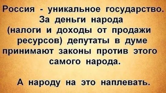 Россия уникальное государство За деньги народа налоги и доходы от продажи ресурсов депутаты в думе принимают законы против этого самого народа А народу на ЭТО НЗПЛЕВЗТЬ