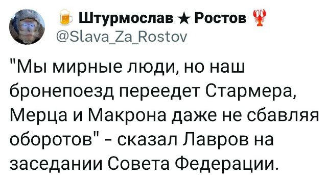"Мы мирные люди, но наш бронепоезд переедет Стармера, Мерца и Макрона даже не сбавляя оборотов" - сказал Лавров на заседании Совета Федерации.
