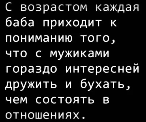 С возрастом каждая баба приходит к пониманию того что с мужиками гораздо интересней дружить и бухать чем состоять в отношениях