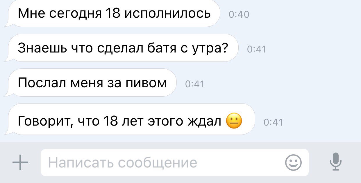 Мне сегодня 18 исполнилось Знаешь что сделал батя с утра Послал меня за пивом Говорит что 18 лет этого ждал б