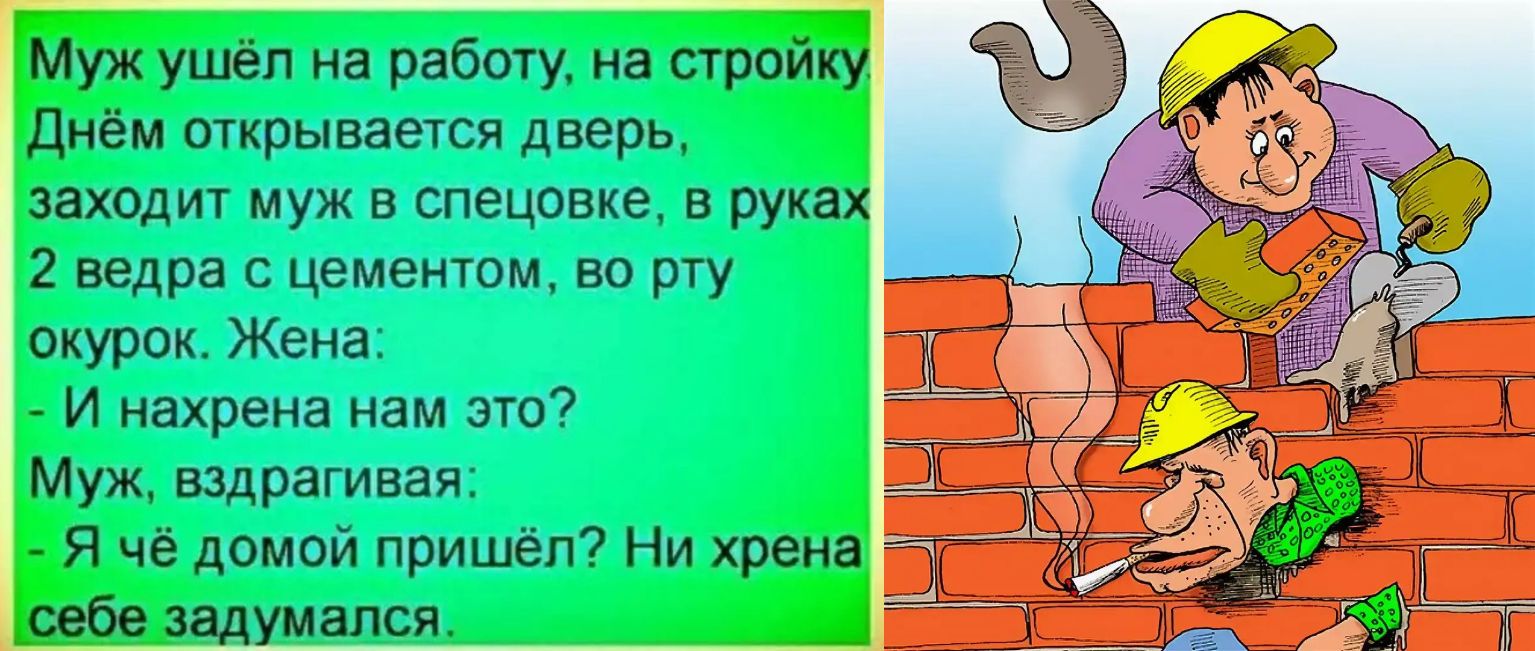 Муж ушёл на работу на стройку Днём открывается дверь заходит муж в спецовке в руках 2 ведра с цементом во рту окурок Жена И нахрена нам это Муж вздрагивая Я чё домой пришёл Ни хрена себе задумался
