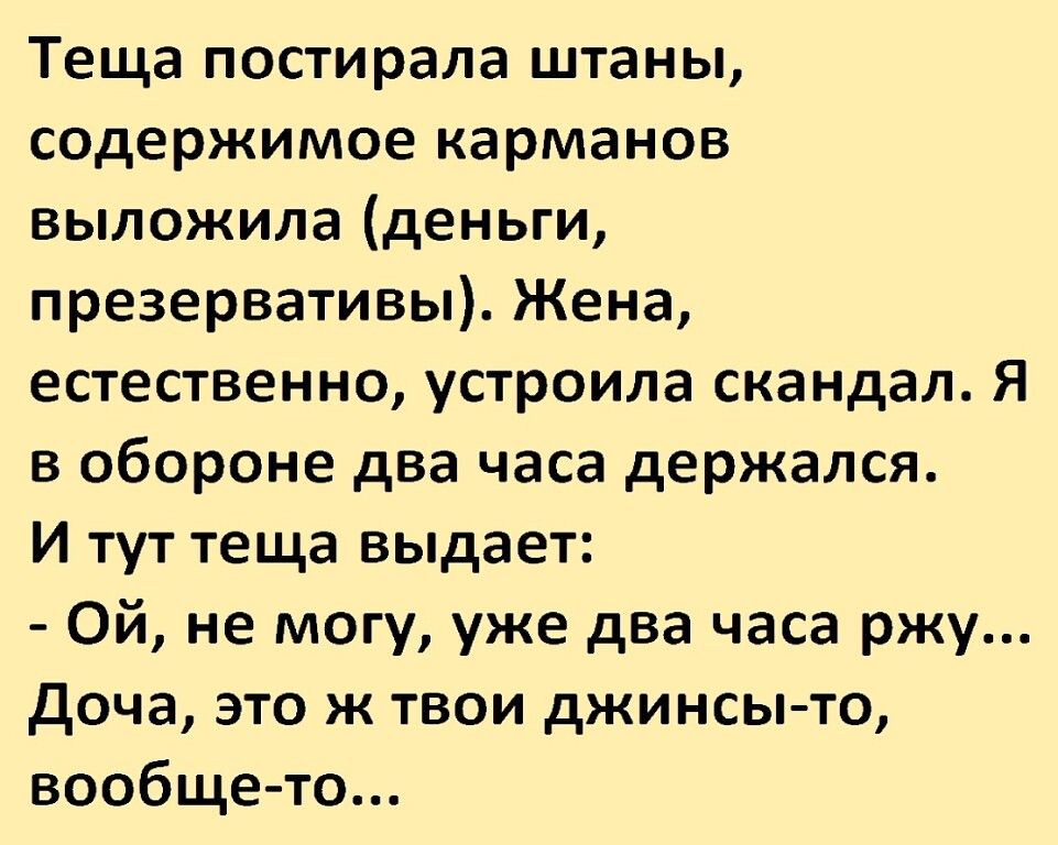 Теща постирала штаны содержимое карманов выложила деньги презервативы Жена естественно устроила скандал Я в обороне два часа держался И тут теща выдает Ой не могу уже два часа ржу доча это ж твои джинсы то вообще то