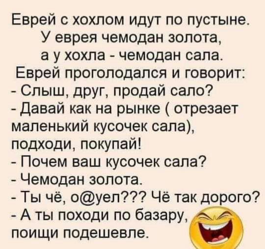 Еврей хохпом идут по пустыне У еврея чемодан золота а у хохла чемодан сапа Еврей проголодался и говорит Слыш друг продай сало Давай как на рынке отрезает маленький кусочек сапа подходи покупай Почем ваш кусочек сала Чемодан золота Ты чё оуеп Чё так дорого А ты походи по базару поищи подешевле