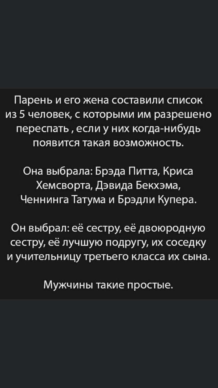 парень И его жена СОСТЭВИЛИ СПИСОК ИЗ 5 человек С КОТОРЫМИ ИМ разрешено переспать если у НИХ когданибудь ПОЯВИТСЯ та кая ВОЗМОЖНОСТЬ Она выбрала Брэда Питта Криса Хемсворта Дэвида Бекхэма Ченнинга Татума и Брэдли Купера Он выбрал её сестру её двоюродную сестру её лучшую подругу их соседку И УЧ итеп ЬНИЦУ третьего КЛЭССЭ ИХ СЫНЭ МУЖЧИНЫ та кие простые