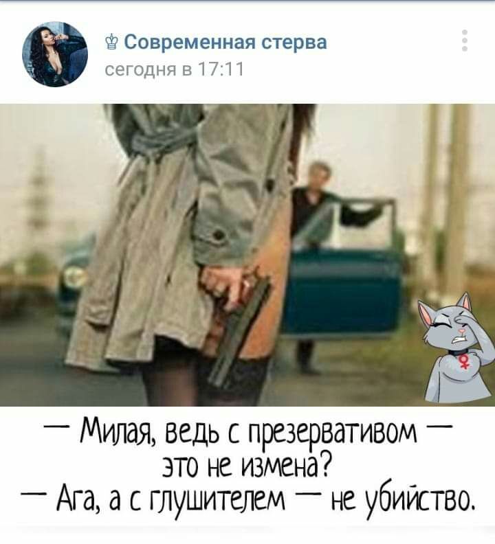 Современная стерва сегодня в 1711 Милая ведь с презервативом это не измена _ _ Ага а с глушителем не убивство