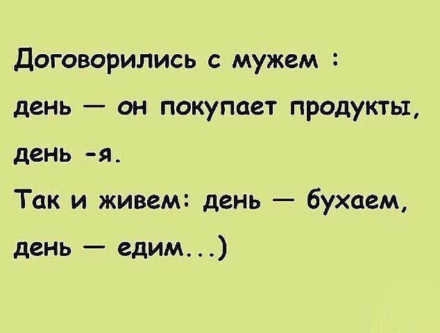 Договорились с мужем день он покупает продукты день я Так и живем день бухаем день едим