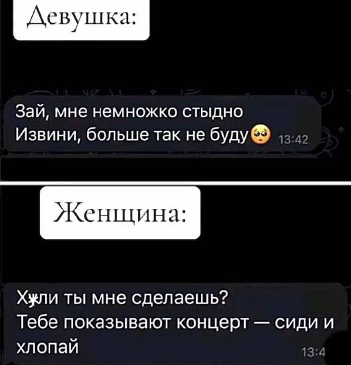 Девушка: Зай, мне немножко стыдно Извини, больше так не буду Женщина: Жули ты мне сделаешь? Тебе показывают концерт — сиди и хлопай