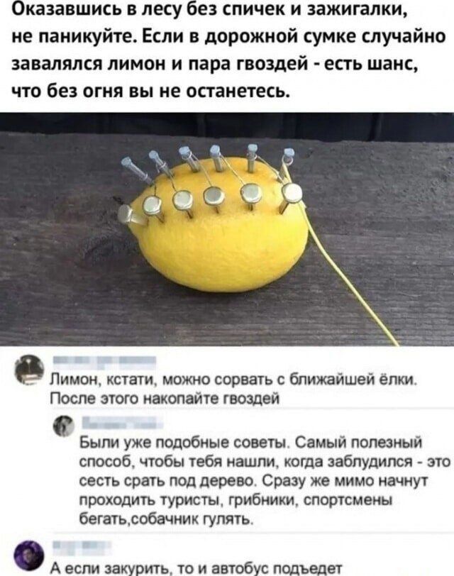 Оказавшись в лесу без спичек и зажигалки, не паникуйте. Если в дорожной сумке случайно завалялись лимон и пара гвоздей - есть шанс, что без огня вы не останетесь. Лимон, кстати, можно сорвать с ближайшей ёлки. После этого накопайте гвоздей. Были уже подобные советы. Самый полезный способ, чтобы тебя нашли, когда заблудился - это есть спать под деревом. Сразу же мимо начнут проходить туристы, грибники, спортивные бегуны, собачники гулять. А если закрутить, то автобус подойдет.