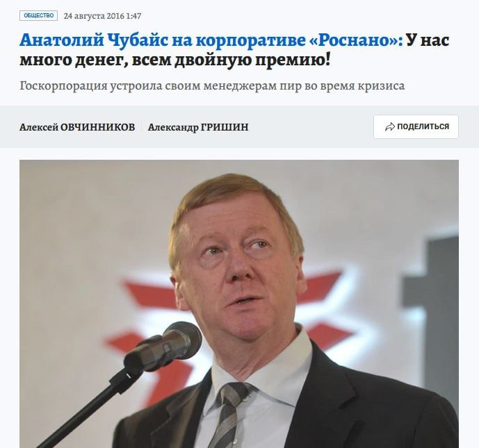 Анатолий Чубайс на корпоративе «Роснано»: У нас много денег, всем двойную премию! Госкорпорация устроила своим менеджерам пир во время кризиса Алексей ОВЧИНИН Александр ГРИШИН