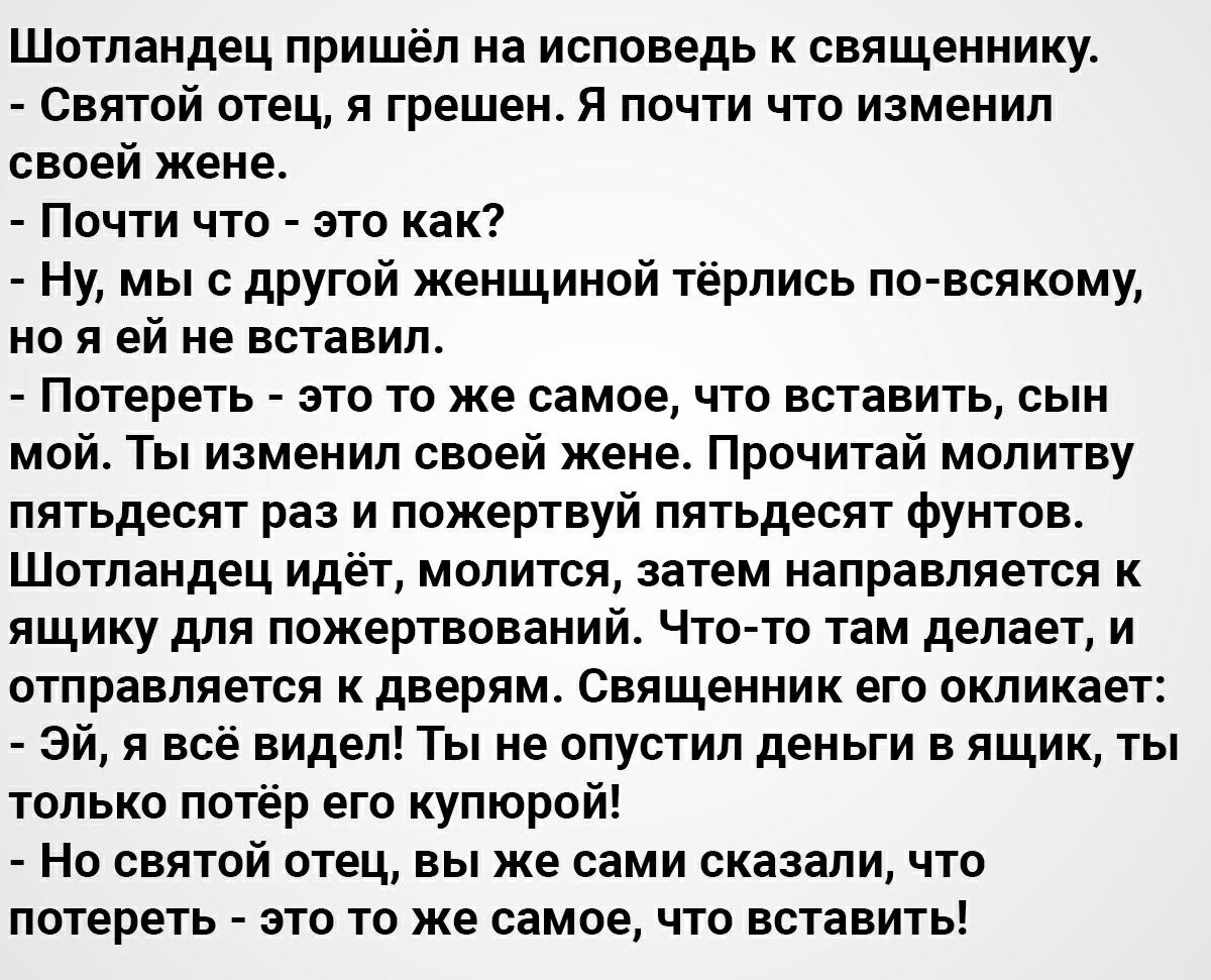 Шотландец пришёл на исповедь к священнику Святой отец я грешен Я почти что изменил своей жене Почти что это как Ну мы с другой женщиной тёрлись по всякому но я ей не вставил Потереть это то же самое что вставить сын мой Ты изменил своей жене Прочитай молитву пятьдесят раз и пожертвуй пятьдесят фунтов Шотландец идёт молится затем направляется к ящику для пожертвований Что то там делает и отправляет