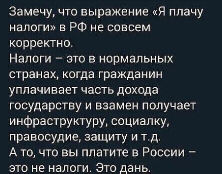 Замечу что выражение Я плачу налоги в РФ не совсем корректно Налоги это в нормальных СТРЭНЭХ КОГДЗ гражданин уплачивает часть дохода государству и взамен получает инфраструктуру социалку правосудие защиту и тд А то что вы платите в России это не налоги Это дань