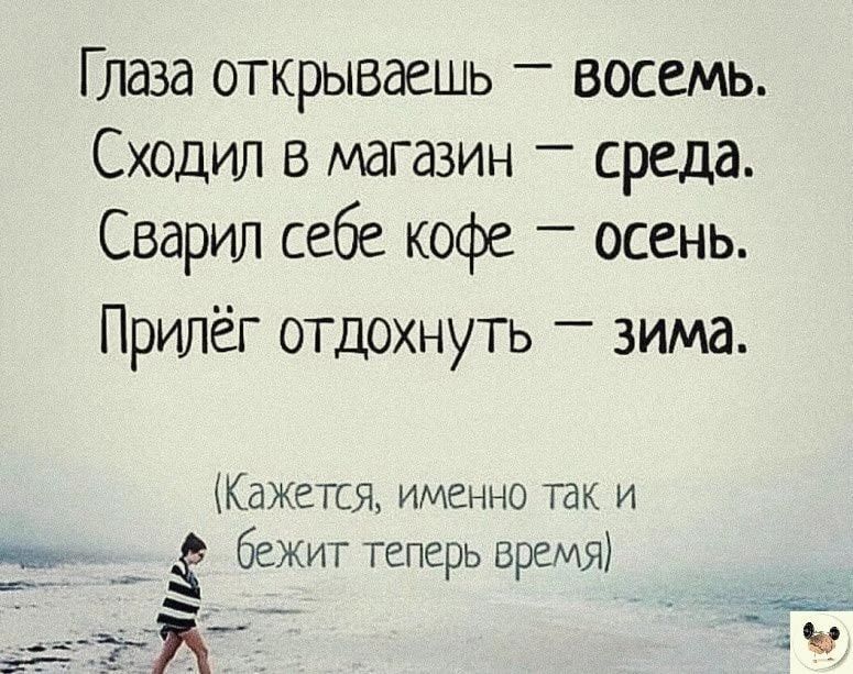 Глаза открываешь _ восемь Сходил магазин _ среда Сварил себе кофе осень Прилёг отдохнуть _ зима Кажется именно так и бежит теперь время _ вы ч