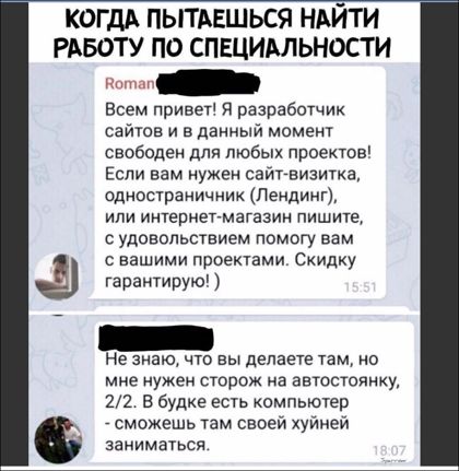 когдд пытдгшься ндйти РАБОТУ по спвцимьности Всем привет я разработчик сайтов и в данный момент свободен для любых проектов Если вам нужен сайтеизитка одностраничник Пендинг или интернет магазин пишите с удовольствием помогу вам с нашими проектами Скидку гарантирую Не знаю ЧТО ВЫ делаете ТЭМ НО мне нужен сторож на автостоянку 22 в будке есть компьютер _ сможешь там своей хуйней заниматься