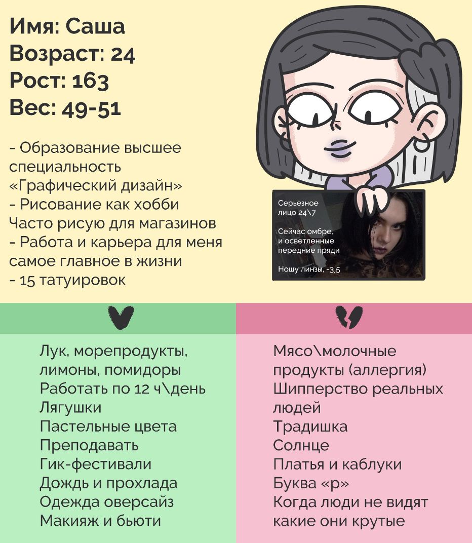 Имя Саша Возраст 24 Рост 163 Вес 49 51 Образование высшее специальность Графический дизайн Рисование как хобби Часто рисую для магазинов Работа и карьера для меня самое главное в жизни 15 татуировок Серьезное лицо 247 Сейчас омбре и осветленные передние пряди Ношу линзы 15 Лук морепродукты лимоны помидоры Работать по 12 чдень Лягушки Пастельные цвета Преподавать Гик фестивали Дождь и прохлада Одеж