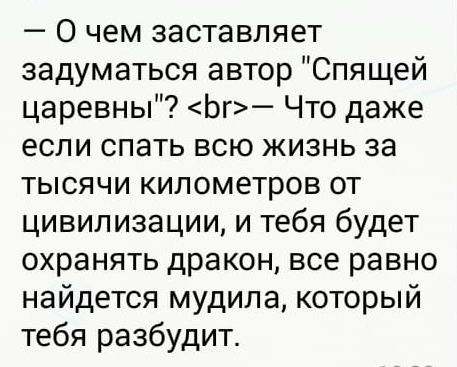 О чем заставляет задуматься автор Спящей царевны Ьг Что даже если спать всю жизнь за тысячи километров от цивилизации и тебя будет охранять дракон все равно найдется мудила который тебя разбудит
