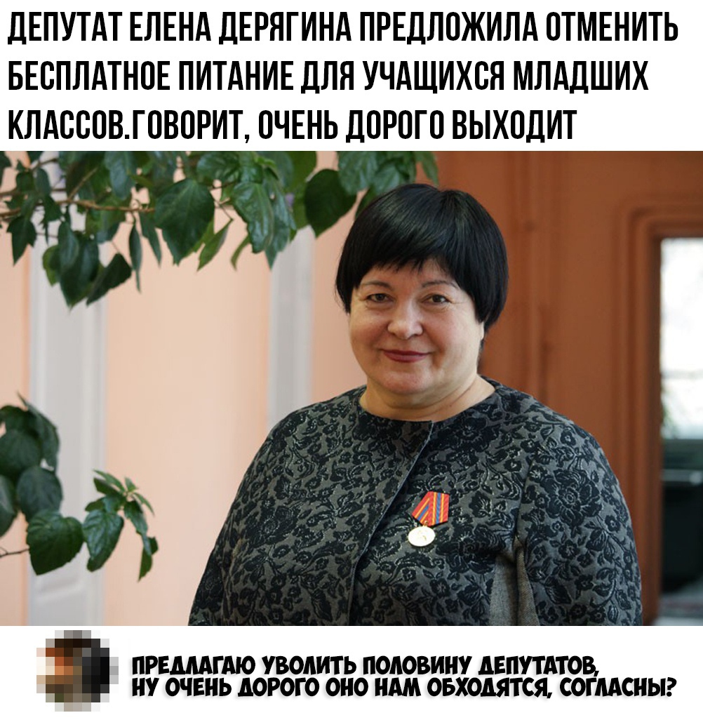 дЕПУТАТ ЕЛЕНА ДЕРЯГИНА ПРЕДЛОЖИЛА ОТМЕНИТЬ БЕСПЛАТНОЕ ПИТАНИЕ ДЛЯ УЧАЩИХСЯ МЛАДШИХ КЛАОООВТОВОРИТ ОЧЕНЬ ДОРОГО ВЫХОДИТ ПРЕДЛАГАЮ УВОАИТЬ ПОАОВИНУ ДЕПУТАТОВ НУ ОЧЕНЬ АОРОГО ОНО НАМ ОБХОАЯТСЯ СОГЛАСНЫ