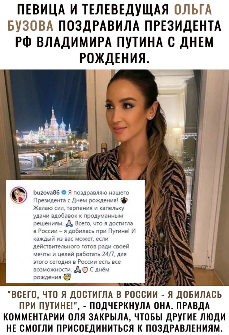 ПЕВИЦА И ТЕЛЕВЕДУЩАЯ ОЛЬГА БУЗОВА ПОЗДРАВИЛА ПРЕЗИДЕНТА РФ ВЛАДИМИРА ПУТИНА С ДНЕМ РОЖДЕНИЯ _ Ьиючавб Я поздравляю нашего Президеита Днем рождения Желаю сил терпения и капельку удачи вдобавок продуманным решениям А Всего что и достигла в России 7 и добилась при Путине И каждый из вас можег если действигельнто готов ради своей мечы и целей работать 247 для этого сегодия России есть все возможности