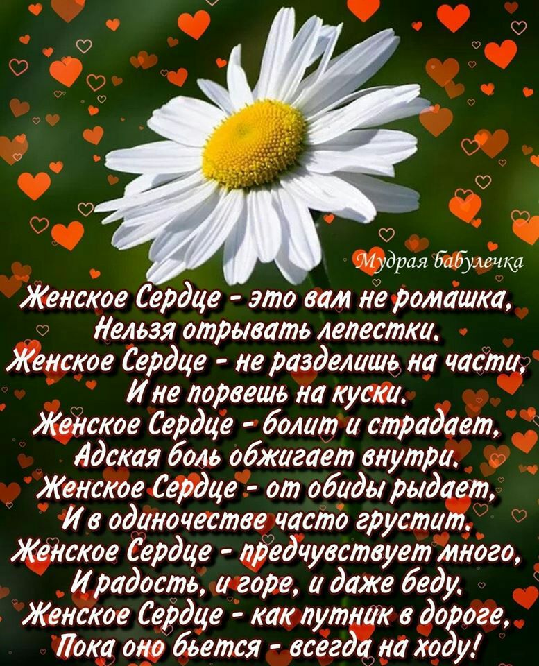 В Мудрая бабутечка Женское Сердце это вам не ромашка ельзя отрывать лепестки Женское Сердце не разделшо на части И не лорвешь на куска Женское Сердце болит и страдает Адская боль обжигает внутри Женское Сердце от обиды рыдает Ив одиночестве часто грустит Женское Сердце предчувстеует много И радость а горе а даже беду Женское Сердце как путник в дороге Лока отдается всегда на ходу