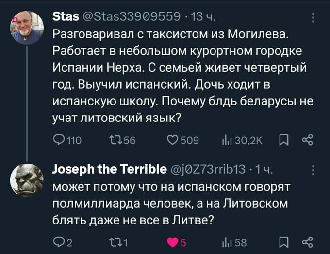 5188 51а533909559 13 ч Разговаривал с таксистом из Могилева Работает в небольшом курортном городке Испании Нерха С семьей живет четвертый год Выучил испанский Дочь ходит в испанскую школу Почему блдь беларусы не учат литовский язык тпо 1356 509 Ммзодк В Зозер е ТетЫе 107 7ЗгпБ13 1ч может потому что на испанском говорят полмиллиарда человек а на Лит