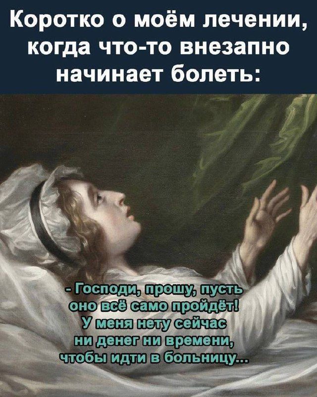 Коротко о моём лечении, когда что-то внезапно начинает болеть: - Господи, прошу, пусть оно всё само пройдёт! У меня нету сейчас ни денег ни времени, чтобы идти в больницу...