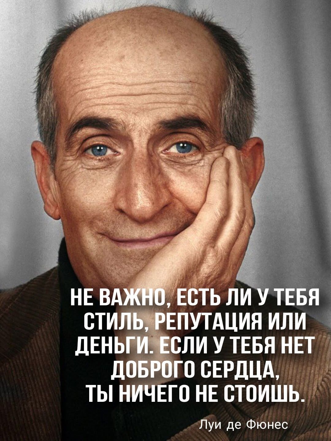 НЕ ВАЖНО, ЕСТЬ ЛИ У ТЕБЯ СТИЛЬ, РЕПУТАЦИЯ ИЛИ ДЕНЬГИ. ЕСЛИ У ТЕБЯ НЕТ ДОБРОГО СЕРДЦА, ТЫ НИЧЕГО НЕ СТОИШЬ. Луи де Фюнес