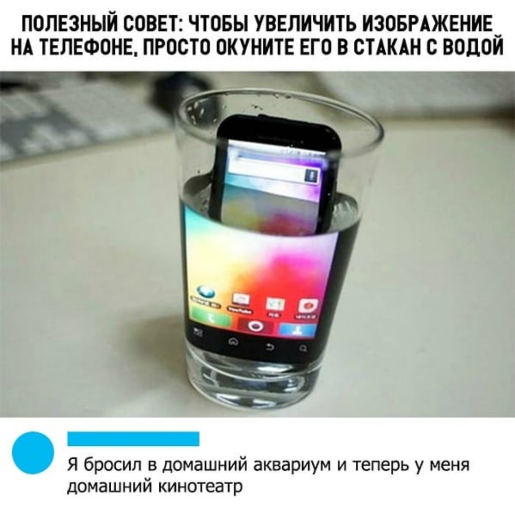 ПОЛЕЗНЫЙ СОВЕТ ЧТОБЫ УВЕЛИЧИТЬ ИЗОБРАЖЕНИЕ_ НА ТЕЛЕФОНЕ ПРОСТО ОКУНИТЕ ЕГО В СТАКАН О ВОДОИ _ Я бросил в домашний аквариум и теперь у меня домашний кинотеатр