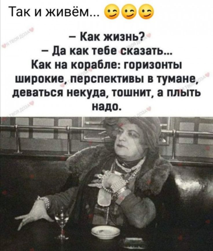 Так и живём Как жизнь Да как тебе сказать Как на корабле горизонты широкие перспективы в тумане деваться некуда тошнит а плыть