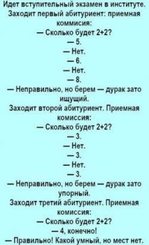 1 игупипльи ш ину пуп Заходи пер ый абитуриет приемки коммисия Сколько буди вп Нет Ни Неприипыю не берем шо ищущий Заходи трой дбятури и приш камнем ско будет и З НИ З Ни 3 Ниша мыш ио Бсрси _пурак то упвриык Знали третий ъбичуриеиу пиши комиссия Сколько буди мт 4 хотю Пра идиш Какой умный ю шт ш