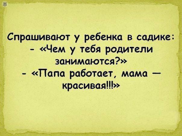 Спрашивают у ребенка в садике: - «Чем у тебя родители занимаются?» - «Папа работает, мама — красивая!!!»