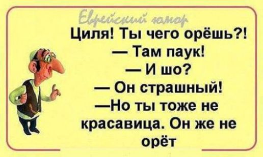 Циля Ты чего орёшь Там паук И шо Он страшный Но ты тоже не красавица Он же не орёт