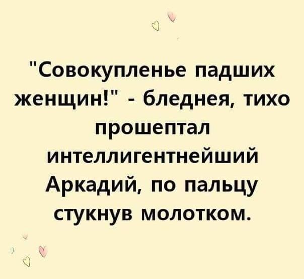"Совокупление падших женщин!" - бледная, тихо прошептал интеллигентнейший Аркадий, по пальцу стукнув молотком.