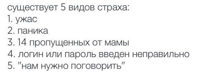существует 5 видов страха 1 ужас 2 паника 3 14 пропущенных от мамы 4 логин или пароль введен неправильно 5 нам нужно поговорить