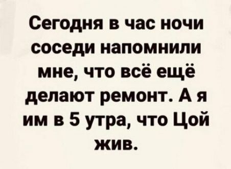 Сегодня в час ночи соседи напомнили мне что всё ещё делают ремонт А я им в 5 утра что Цой жив