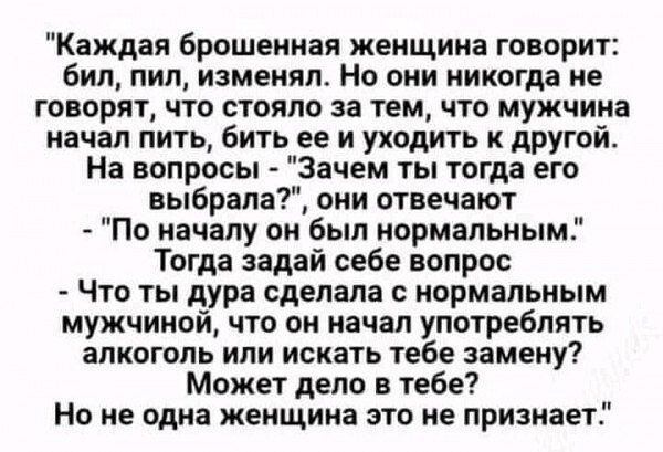 "Каждая брошенная женщина говорит: бил, пил, изменял. Но они никогда не говорят, что стояло за тем, что мужчина начал пить, бить её и уходить к другой. На вопросы – 'Зачем ты тогда его выбрала?', они отвечают – 'По началу он был нормальным'. Тогда задай себе вопрос: Что ты дура сделала с нормальным мужчиной, что он начал употреблять алкоголь или искать тебе замену? Может дело в тебе? Но не одна женщина это не признает."