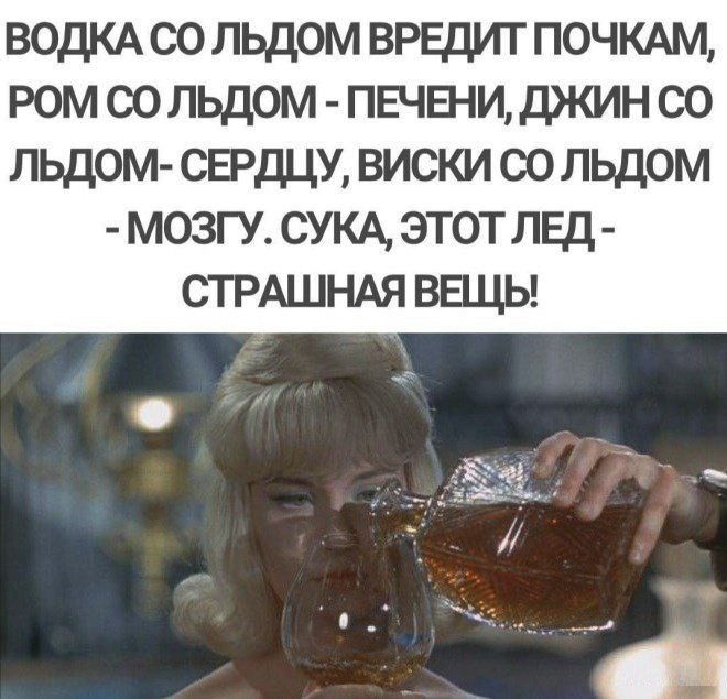 ВОДКА СО ЛЬДОМ ВРЕДИТ ПОЧКАМ, РОМ СО ЛЬДОМ - ПЕЧЕНИ, ДЖИН СО ЛЬДОМ-СЕРДЦУ, ВИСКИ СО ЛЬДОМ - МОЗГУ. СУКА, ЭТОТ ЛЕД - СТРАШНАЯ ВЕЩЬ!