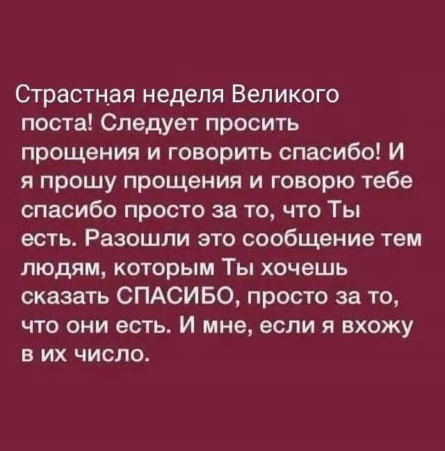 Страстная неделя Великого поста! Следует просить прощения и говорить спасибо! И я прошу прощения и говорю тебе спасибо просто за то, что Ты есть. Разошли это сообщение тем людям, которым Ты хочешь сказать СПАСИБО, просто за то, что они есть. И мне, если я вхожу в их число.