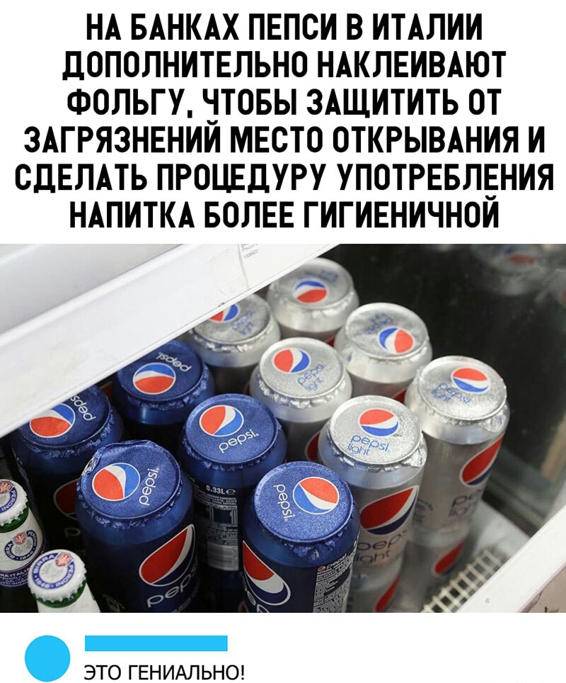 НА БАНКАХ ПЕПСИ В ИТАЛИИ дОПОЛНИТЕЛЬНО НАКЛЕИВАЮТ ФОЛЬГУ ПОБЫ ЗАЩИТИТЬ ОТ ЗАГРЯЗНЕНИИ МЕСТО ОТКРЫВАНИЯ И СДЕЛАТЬ ПРОЦЕДУРУ УПОТРЕБЛЕНИЯ НАПИТКА БОЛЕЕ ГИГИЕНИЧНОИ ЭТО ГЕН ИАЛЬНО